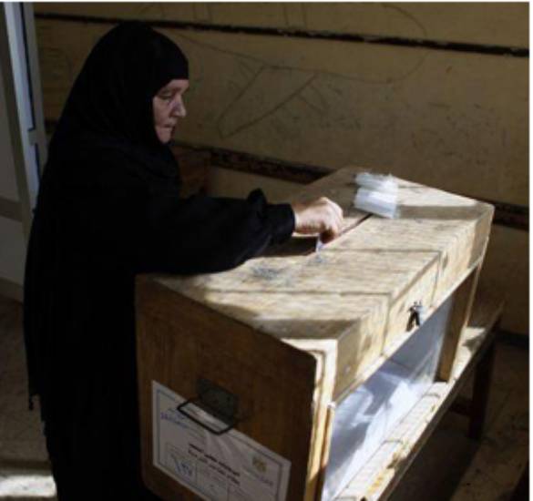An Egyptian woman casts her vote at a polling centre during the second day of the election runoffs for Egypt's parliament, in Giza on December, 22, 2011.