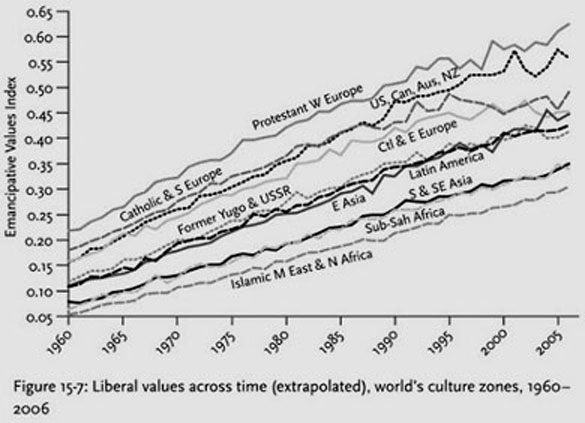 Think of “emancipative values,” charted on the y axis, as broadly liberal values. To be more precise, the surveyers define emancipative values as those which emphasize freedom of choice and equality of opportunities. “Emancipative values, thus, involve priorities for lifestyle liberty, gender equality, personal autonomy and the voice of the people.”