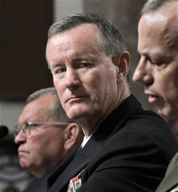 FILE - In this Tuesday, June 28, 2011 file photo, U.S. Navy Vice Adm. William McRaven, centre, nominated by Obama to lead Special Operations Command, JSOC’s parent organization, listens to Marine Lt. Gen. John Allen, right, testify during their confirmation hearing on Capitol Hill in Washington. McRaven was nominated to lead the Special Operations Command just a month before he oversaw the raid on Osama bin Laden's compound. He has ordered military files about the Navy SEAL raid on Osama bin Laden’s hideout to be purged from Defense Department computers and sent to the CIA, where they could be more easily shielded from ever being made public. At left is Gen. James D. Thurman. (AP Photo/J. Scott Applewhite, File)